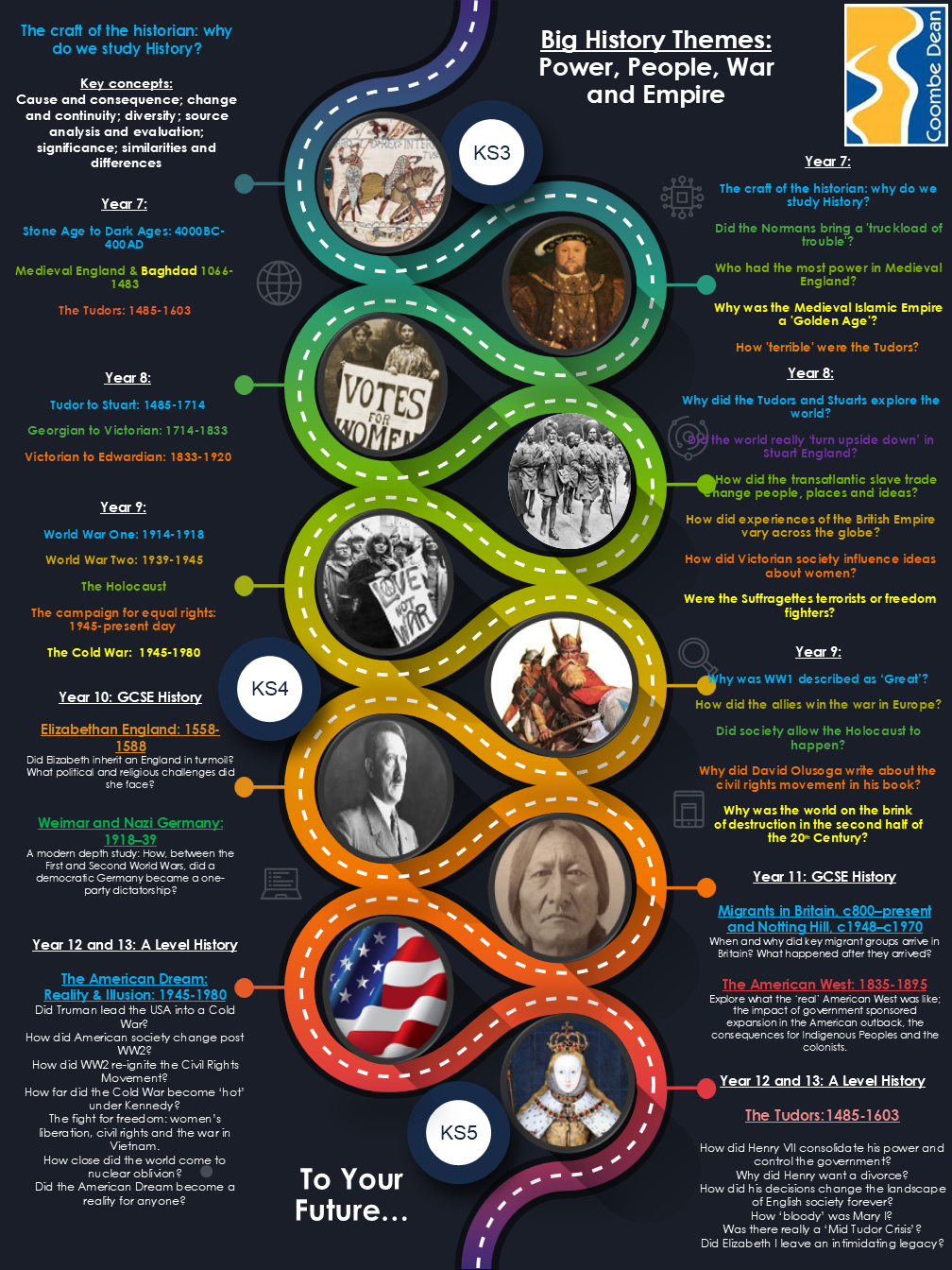 History at KS3 aims to give students a general grounding in British history from 1066 to the present day. Key skills, such as interrogating evidence, understanding different interpretations of history and developing arguments are also developed. We use the KS3 National Curriculum as the basis for our studies, although are not constrained by it.